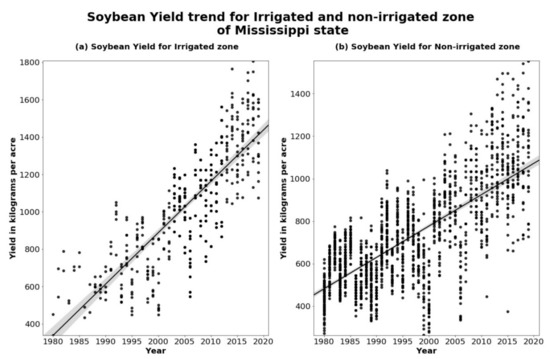 The Supplementary Materials are available online at https://www.mdpi.com/article/10.3390/rs13122249/s1. Figure S1. Seasonal minimum temperature (a), mean temperature (b), and maximum temperature (c), trend for Irrigated zone of Mississippi states from 1980 to 2019; Figure S2. Seasonal minimum temperature (a), mean temperature (b), and maximum temperature (c), trend for Non-irrigated zone of Mississippi states from 1980 to 2019; Figure S3. Seasonal Precipitation change for Irrigated (a) and Non-irrigated (b) zone of Mississippi states from 1980 to 2019; Figure S4. Seasonal Soybean Yield change for Irrigated (a) and Non-irrigated (b) zone of Mississippi states from 1980 to 2019; Figure S5. The grid map of Climatic variables, such as minimum temperature (a), mean temperature (b), maximum temperature (c), Precipitation (d), and residuals from best yield model for the irrigated zone of Mississippi; Figure S6. The grid map of Climatic variables, such as minimum temperature (a), mean temperature (b), maximum temperature (c), Precipitation (d), and residuals from best yield model for the non-irrigated zone of Mississippi. Table S1. The results of Mann-Kendal test for the Tmin, Tmean, Tmax, Precipitation, and Yield from time series of 1980–2019 for irrigated and non-irrigated zones of Mississippi; Table S2. The results of linear and multilinear models for each 10-year period from time series of 1980–2019 for irrigated counties in Mississippi; Table S3. The results of linear and multilinear models for each 10-year period from time series of 1980–2019 for non-irrigated county of Mississippi; Table S4. The results of linear and multilinear models for time series of 1980–2019 for irrigated agricultural districts of Mississippi; Table S5. The results of linear and multilinear models for time series of 1980–2019 for non-irrigated agricultural districts of Mississippi; Table S6. The results of linear and multilinear models for irrigated and non-irrigated zone of Mississippi of 1980–2019 period.