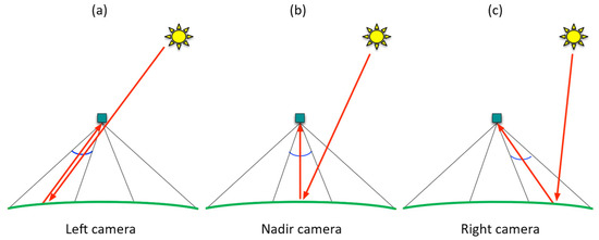 The figure presents a simplified scheme of Proba-V across-track observation geometry, which is composed of three overlapping cameras arranged in a fan-shaped configuration. The geometry of observation in three cameras is presented in the panels: (a) left camera, (b) nadir camera, (c) right camera. The position of the sun is simplified for the sake of clarity, although the basic angular configuration of the descending morning orbit is maintained, meaning the left camera is looking westward, away from the sun, with prevalence of backscattering conditions, while the right one is looking eastward, towards the sun, with prevalence of forward scattering.