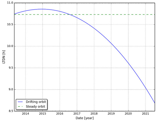 Proba-V platform is lacking for an on-board propulsion system to maintain the orbit within a stable overpass time. As a result, the orbital plane was naturally drifting since launch, and the Local Time at Descending Node (LTDN) crossing the Equator was steadily varying during mission lifetime. The orbit’s injection was made as to delay the start of the orbital decay and to maintain the LTDN within an acceptable range of 10:45 a.m. +/−15 min during the first 4 years of mission. This late morning overpass time was set in continuity to SPOT-VGT and it is typically adopted for land-focused missions to minimize cloud coverage, as defined for Sentinel-2 [21] mission.