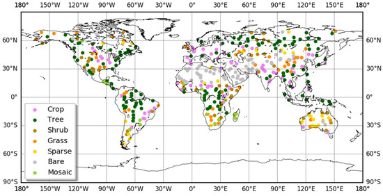 The temporal consistency of TOC products was evaluated over a large set of globally distributed and spatially homogeneous land sites. To this purpose, the BELMANIP-2 (BEnchmark Land Multisite ANalysis and Intercomparison of Products) list of sites was considered [34]. These sites were originally proposed as benchmark for intercomparison of satellite-derived coarse resolution biophysical products [34]; to this end, the sites were selected to be homogeneous at kilometric scale, almost flat and with a minimum proportion of urban area or permanent water bodies. This site selection is well suited for the purpose of the present study, since it allows verifying the presence of orbit-induced drifts and their correlation with latitude, biome type or environmental conditions. The location of the considered BELMANIP-2 sites is displayed in Figure 3 together with the corresponding global land cover class, derived from the ESA Climate Change Initiative (CCI) Land Cover Version 2.0 product [35].