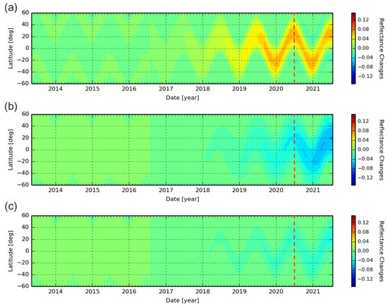 The results of Figure 5 show that the evolution of synthetic surface reflectances follows SZA seasonal and inter-annual changes. A step-wise decrease is observed during mid-2016; this is the time when the LTDN starts to deviate from a steady orbit moving towards early morning overpasses (see Figure 2). Reflectance changes remain within a range of [−0.01, 0.01] until mid-2017, when larger deviations start to appear for all cameras. This is the time when LTDN reaches 10:30 a.m. and the rate of decay starts to grow. Overall, the reflectances absolute changes are stronger in the latitude range [−40°, 40°] during hemispherical summertime conditions, in correspondence to the larger SZA variations (see Figure 4).