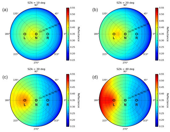 The figure shows Proba-V NIR band BRDF for (a) SZA = 10°, (b) SZA = 20°, (c) SZA = 30°, (d) SZA = 40°. Distance from the origin is the zenith angle, while azimuth angles span the polar plot plane. The VZA positions of the left (L), nadir (N) and right (R) cameras are shown in each plot with black circles. In the used convention, the SAA is 180°, the VAA spans 0–360°, i.e., the region with relative azimuth angle (RAA = SAA–VAA) < 90° corresponds to the backscattering, while RAA > 90° to the forward scattering directions. Note that the convention used here for VAA and SAA is different from the one reported in the operational products, although the relative position of the sun and viewing azimuth directions are preserved.