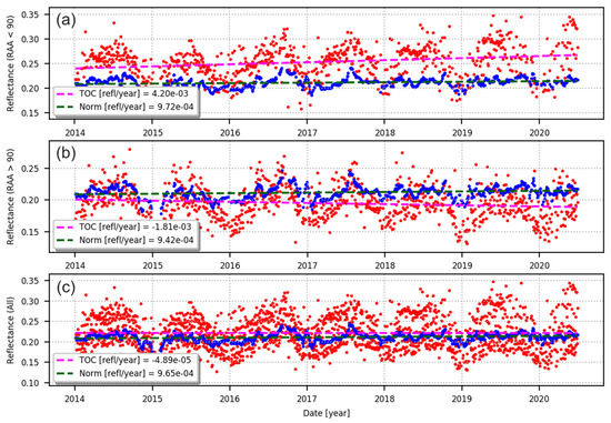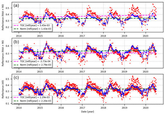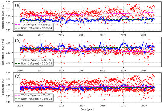 The figure shows TOC reflectance in NIR band for a bright desert site (Belmanip-207) located in Egypt (lat/lon = 27.87°/28.87°). The plots present the temporal series of TOC (red) and BRDF-normalized (blue) reflectances for three angular conditions: (a): RAA < 90°, (b) RAA > 90°, (c): “All”; the latter corresponds to retaining all observations in the fit. The fitted linear curves are also shown for TOC (purple) and BRDF-normalized (green) data with drift values reported in the legend.