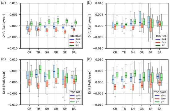 The figure shows boxplots of estimated drifts in TOC products aggregated per land cover class for the backward (blue) and forward (red) scattering directions, and their differences (green). Results are presented for bands: (a) Blue, (b) Red, (c) NIR, (d) SWIR. Aggregation is performed per land cover class: Crop (CR), Tree (TR), Shrubland (SH), Grassland (GR), Sparse vegetation (SP), Bare soils (BA). The height of the box extends from the upper to the lower quartile, Q3 and Q1, corresponding to the 75th and 25th percentiles, respectively. The median is plotted inside the box and the bars extend to 1.5 × IQR from the lower and upper quartiles, where IQR = Q3 − Q1.
