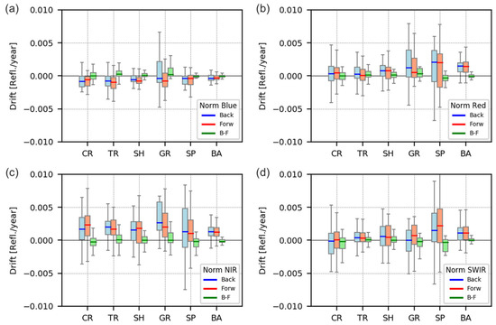 The statistical analysis for TOC and BRDF-normalized reflectances is presented in Figure 12 and Figure 13. The results of Figure 12 provide a comprehensive verification at a global scale of the azimuthal asymmetry observed over the four sample sites. In particular, estimated drifts in TOC products are higher and generally positive in the backward scattering direction, and lower and mostly negative in the opposite direction. This general behavior is particularly evident for NIR and SWIR bands, as predicted in the simulation study. The Blue and Red bands (Figure 12, panels (a) and (b)) show comparable patterns, although the drift difference () is significantly lower than the infrared bands; this is due to the lower dynamic range of surface reflectance in the visible range. In the infrared bands, the asymmetry is typically higher over cropland, forest and shrubland sites. Larger variability in the estimated drift is observed for sparse vegetation and grassland sites, which can be related to the less representative statistical population within these classes. The drift difference is lower, but still clearly observed, over bare soils for all spectral bands, particularly in the infrared bands.