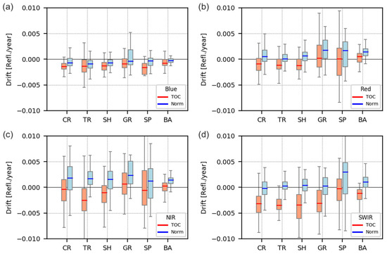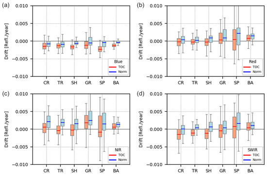 The figure shows the boxplots of estimated drifts in the four spectral bands for near-nadir observations (VZA < 10°) aggregated per land cover class: Crop (CR), Tree (TR), Shrubland (SH), Grassland (GR), Sparse vegetation (SP), Bare soils (BA). Estimated drifts for TOC (red) and BRDF-normalized (blue) reflectances are presented for the bands: (a) Blue, (b) Red, (c) NIR, (d) SWIR. The parameters of the boxplot chart are those used and described in Figure 12.