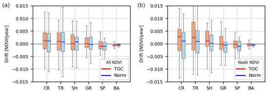 The figure shows the boxplots of estimated drifts in NDVI considering (a) all acquisitions and (b) near-nadir acquisitions (VZA < 10°). Results are aggregated per land cover class: Crop (CR), Tree (TR), Shrubland (SH), Grassland (GR), Sparse vegetation (SP), Bare soils (BA). Estimated drifts for TOC (red) and BRDF-normalized (blue) NDVI are plotted. The parameters of the boxplot chart are those used and described in Figure 12.