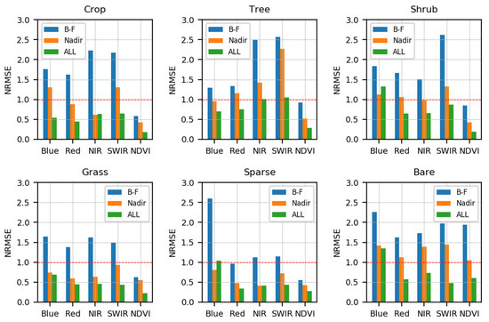 The NRMSE provides a quantitative measure of how much the observed differences between the drifts estimated for TOC and BRDF-normalized reflectances or NDVI lie within the range of variability of the data. In particular, NRMSE values larger than 1 indicate that the orbital drift has a statistically significant impact on the TOC data. Conversely, values lower than 1 correspond to conditions when the orbital effect cannot be reliably identified within the statistical ensemble of sites for the considered land cover class.