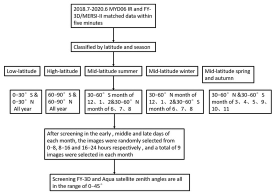 The training and validation sets were derived from overlapping data from Aqua/MODIS and FY-3D/MERSI-II for 2 years (July 2018 to June 2020). The orbits of the two satellites do not coincide completely; hence, the orbit prediction method was adopted to overlap the image times of both orbits passing the same region with a time of difference less than 5 min. The different satellites also have spatial and parallax-effect differences [36]. The zenith angles of both the Aqua and the FY-3D satellites were screened in the overlap region of 0°–45° to reduce image deformation. To ensure that the training samples were representative on a global scale, a sample scheme was used to account for the influence of latitude, season, and overpass time (Figure 1). A total of 70,313,100 geo-located pixels were involved, with 49,546,611 being used for validation.