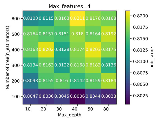 According to RF software package documentation, the empirical default value of random-split predictor variable max_features for the RF classification model is equal to the square root of the total number of predictive variables or features (http://scikit-learn.org/stable/modules/ensemble.html, accessed on 12 April 2021), and this parameter was set on the basis of model input-variable data. Due to the change in the amount of training data, related parameters of the RF model were retrained iteratively. The OOB score represents the fitting result of the unbiased estimation of the RF model; a higher OOB score denotes a better fit of the model. A higher number of trees in the forest (n_estimators) and a greater maximum depth of the trees (max_depth) lead to higher model fitting accuracy and a more complex model. Therefore, it is necessary to find a balance between model accuracy and running time by iterative training.