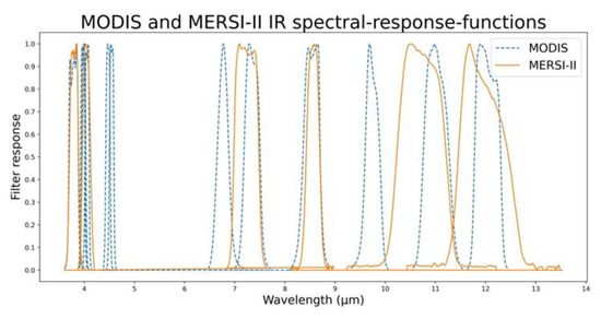 FY-3D/MERSI-II is capable of global observations with two IR split-window bands of 250 m resolution, providing possible high-precision quantitative atmospheric, land, and oceanic products such as cloud, aerosol, water vapor, land surface characteristics, and ocean water color [39]. L1 data were obtained from the Fengyun Satellite Data Service Network (http://satellite.nsmc.org.cn/, accessed on 12 April 2021). Compared with the previous MERSI-I [40], the improved MERSI-II added NIR and IR spectral bands with central wavelengths of 1.38, 3.8, 4.05, 7.2, and 8.55 μm. The original 250 m resolution spectral band of central wavelength 11.25 μm (bandwidth 2.5 μm) was converted to two split-window bands of central wavelengths 10.8 and 12 μm. These IR bands also allow CP determination at night. Moreover, FY-3D/MERSI-II has similar six IR spectral bands of MODIS, which were used for CP training. The bandwidths of some FY-3D/MERSI-II IR bands are slightly wider than those of Aqua/MODIS, along with different central wavelengths (see Figure 3). These differences in sensor spectral features may lead to noticeable deviations in CP retrievals if the MODIS algorithm is directly applied to FY-3D/MERSI-II.