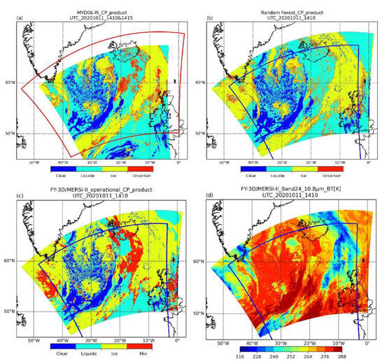 Comparisons of CP phase on 11 October 2020, in mid-latitude spring and autumn for (a) the MODIS CP product at 14:10 and 14:15 UTC, (b) the RF CP product at 14:10 UTC, (c) the operational FY-3D/MERSI-II CP product at 14:10 UTC, and (d) the FY-3D/MERSI-II band-24 BT at 14:10 UTC. The red box is the outline of the 14:10 UTC FY-3D image, and the blue box is the contour of the 14:10 and 14:15 UTC Aqua images.