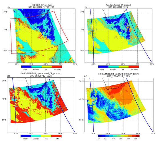 Comparisons of CP in mid-latitude winter (12 July 2020) for (a) the MODIS CP product at 12:25 and 12:30 UTC, (b) the RF CP product at 12:25 UTC, (c) the operational FY-3D/MERSI-II CP product at 12:25 UTC, and (d) the FY-3D/MERSI-II band 24 BT at 12:25 UTC. The red box is the outline of the 12:25 UTC FY-3D image, and the blue box is the contour of the 12:25 and 12:30 UTC Aqua images.