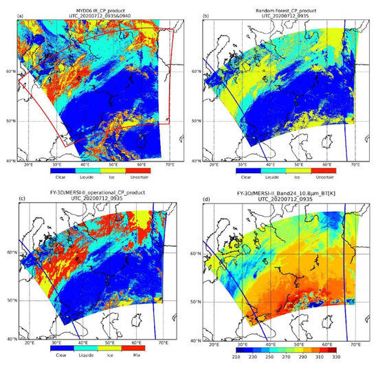 Comparisons of CP in mid-latitude summer, 12 July 2020, for (a) the MODIS CP product at 09:35 and 09:40 UTC, (b) the RF CP product at 09:35 UTC, (c) the operational FY-3D/MERSI-II CP product at 09:35 UTC, and (d) the FY-3D/MERSI-II band 24 BT image at 09:35 UTC. The red box is the outline of the 09:35 UTC FY-3D image, and the blue box is the contour of the 09:35 and 09:40 UTC Aqua images.