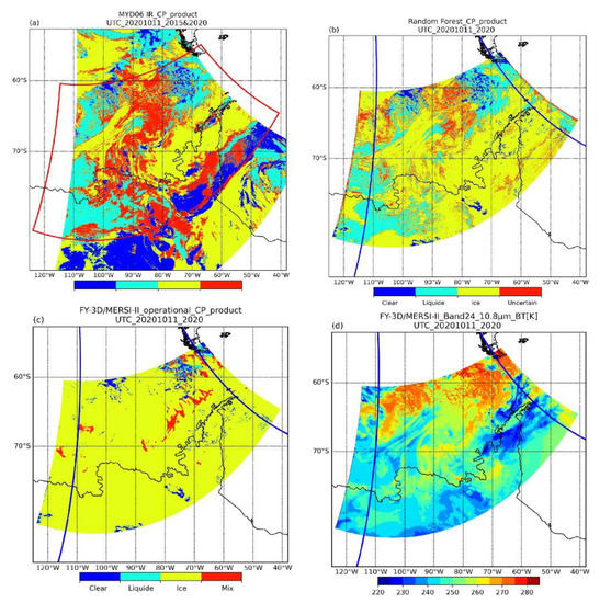 Comparisons of CP products for high latitudes on 11 October 2020 for (a) the MODIS CP product at 20:15 and 20:20 UTC, (b) the RF CP product at 20:15 UTC, (c) the operational FY-3D/MERSI-II CP product at 20:15 UTC, and (d) the FY-3D/MERSI-II band 24 BT image at 20:15 UTC. The red box is the outline of the 20:15 UTC FY-3D image, and the blue box is the contour of the 20:15 and 20:20 UTC Aqua images.
