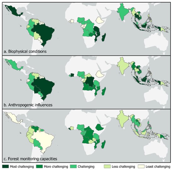The challenges and needs of each country for forest monitoring-related research were characterized by open-source datasets. For the characterization, three criteria were identified. Firstly, the biophysical conditions were characterized, to represent the challenges of performing research due to the countries’ natural environments. Secondly, the anthropogenic influences were characterized to represent the need to identify changes. This was done using proxies of forest change. Lastly, the national forest monitoring capacity was identified, which represents the capacities of the countries to monitor their forests and report on their monitoring. The countries were ranked from least to most challenging, and the assessment of the three criteria was as follows:
