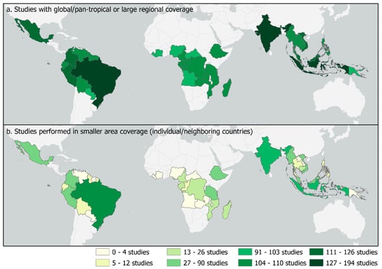 A total of 521 studies identified in the literature review were distributed throughout the area of interest, with more global/pan-tropical and large regional studies than studies that were performed in one or adjacent countries (419 studies performed in small area coverage) (Figure 2). More research was carried out in Asia and the Americas than in Africa, with concentrations in Brazil, India, and Indonesia.