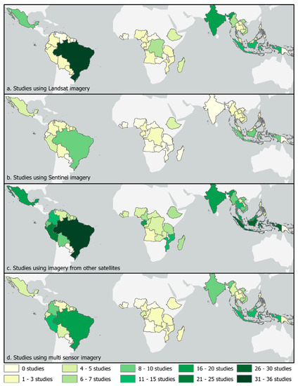 The two satellites that were used the most in the observed studies were Landsat followed by Sentinel, and for both, the distribution of their use was not equally spread across the study area (Figure 3). Although the pattern is largely driven by the frequency of studies in each country (Figure 2), there are some differences, and also variations in the general pattern of more Landsat studies. One example is Peru, which has more Sentinel studies than Landsat.