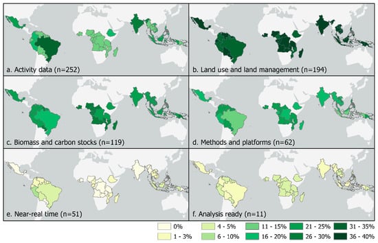 Classification of the countries regarding the percentage of every category of study performed in each country between 2018 and 2020, where n represents the number of studies in each category. The percentages for each country across all panels total 100% (e.g., Brazil: 32.5% of studies related to activity data, 31.4% to land use and land management, 18.1% to biomass and carbon stocks, 13.4% to methods and platforms, 3.1% to near-real time alerting, and 1.5% to analysis ready).