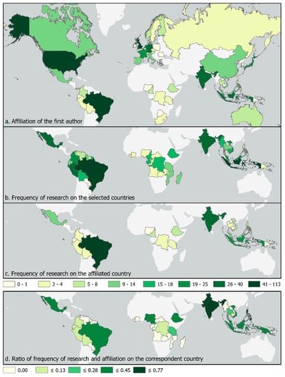 The country of the affiliation(s) of the first authors of each of the papers showed a higher presence of affiliations in the northern hemisphere (Figure 5). Of research carried out in the 35 selected countries, most had a first author that was affiliated in the country where the research was being carried out. However, 16 of the countries did not have any studies where the leading author was affiliated with them. The calculated ratio between the frequency of research and the frequency of affiliation in the same country shows that, except for India, all the countries had a ratio that did not even reach 0.5 (meaning that less than half the time, the first author had no affiliation in that country).