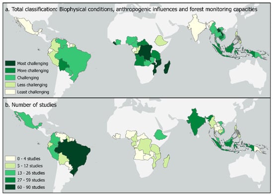 The three variables used to identify the challenges, and need for forest monitoring (biophysical conditions, anthropogenic influences, and forest monitoring capacities) were combined to give an overall level of challenging characteristics related to forest monitoring research. This combination is represented in Figure 6, together with the number of studies performed in one or adjacent countries.