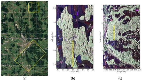 (a) Locations depicted (yellow polygons) on a Google Earth image, and Pauli images corresponding to the sites covered by the processed data sets (b) Froschham forest (northern yellow polygon) and (c) Traunstein “Bürgerwald” forest (southern yellow polygon). The yellow lines in (b,c) indicate the locations of transects considered for the examples in Section 5, Section 6 and Section 7.
