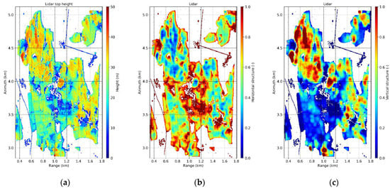 Froschham test site: lidar (a) top height (maximum height in 5 × 5 m), and structure indices (50 × 50 m) (b) and (c) .