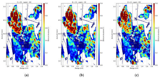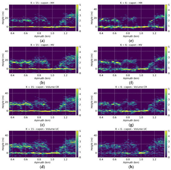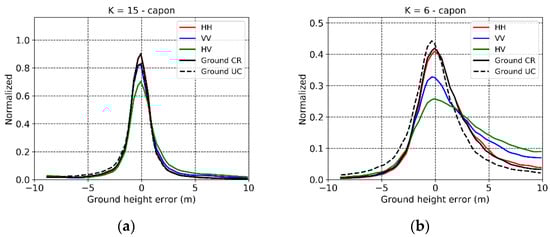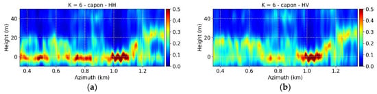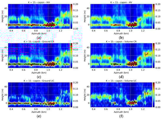Figure 3c,d show the Capon profiles corresponding to and for the selected azimuth line. It is apparent that the ground contribution is stronger in than in HH, and weaker in than in HV. However, a residual volume component remains in and a residual ground in . Consistent with the underlying RVoG assumption in the optimized solution (19) there are no differences in the appearance of the volume components in the different profiles. On the other hand, given the high Rayleigh vertical resolution and the number of images available, the attenuation or amplification of the ground scattering component does not change significantly the null-placing mechanism of the Capon estimator.