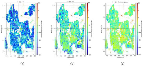Froschham test site. L-band ground-to-volume ratios (multilook 20 × 20 m) with in the (a) HV, (b) HH and (c) maximum ground polarization channels.
