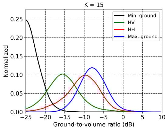 The profiles in Figure 3 show clearly the change and sensitivity of the L-band TomoSAR profiles as a function of polarization. Remembering (6), in the frame of the RVoG the polarimetric dependency can be characterized quantitatively by estimating the variation of across . Under the Dirac- assumption for the ground reflectivity, a sufficient condition to estimate a unique by regularizing the Sum-of-Kronecker-Product decomposition (19) is to use the ground height. A detailed description and discussion of this is reported in [57]. Here, the lidar DTM has been used. The regularization procedure proposed in [57] provides estimates of close to in the majority of cases. Notice that this solution is particularly meaningful also from a physical point of view: the corresponding points within the unitary circle are the most robust ones with respect to the number of images used in the optimization. In contrast, and come closer to the coherence region at the change of the number of images and/or image geometry [58]. The estimation of and follows the estimation of by applying a least-squares optimization. The diagonal elements of and are the separated ground and volume powers in the different polarimetric channels and additionally allow the calculation of the ground-to-volume ratios (, and in the HH, HV and VV channels. Finally, the classical polarimetric contrast optimization can be applied to find the polarimetric channel with the maximum and minimum ground-to-volume ratios and [48,59]. The maps of , and are shown in Figure 4, and they are consistent with the differences seen in the profiles of Figure 2. By comparing these maps with the lidar height and structure maps in Figure 2, a relationship between and with height becomes apparent: the taller the stands, the more attenuated the ground scattering. This agreement is not visible in as the ground scattering is weaker. On the other hand, no relevant correlation between ground-to-volume ratios and (geometric) structure stands out. A larger role is certainly attributed to the dielectric properties of the different stands [14,37]. The distributions of , , and are shown in Figure 5. It is apparent that the change of polarization can change the ground-to-volume ratio up to 20 dB. and are separated by around 5 dB, and the optimization of polarization increases up to 3 dB.