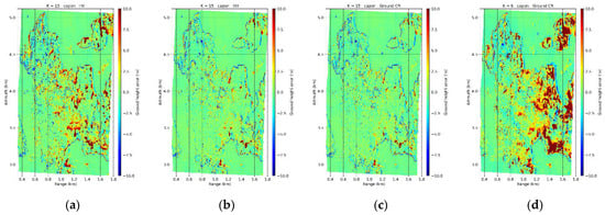 Froshham test site. Ground estimation error maps obtained using the L-band Capon profiles (multilook 20 × 20 m) with (a) in HV, (b) in HH, (c) for and (d) for .