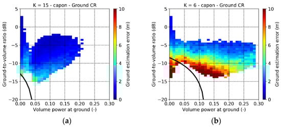 Finally, Figure 8a shows the distribution of the (mean) ground estimation error in absolute value obtained by using the ground-optimized in the plane defined by the corresponding and the volume-only Capon amplitude estimated at the lidar ground. For this diagram, only the estimates corresponding to the “true” ground peak (i.e., the closest to the reference lidar ground) have been considered. The black curve indicates the limit of (14) and represents the minimum ground-to-volume ratio at which a peak corresponding to the ground scattering can be detected in the Capon profiles for a given fixed threshold. All points considered are above the detection limit, and the height error increases in correspondence to a low and/or . If , the minimum detected ground is for dB and the height error is about 4 m. Errors lower than or equal 2 m are obtained already for dB independently of .