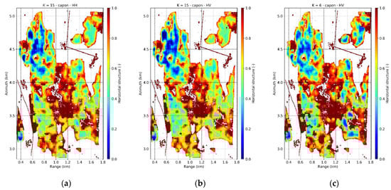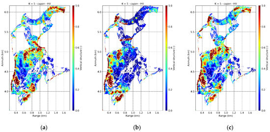 The horizontal and vertical structure concept and formulations described in Section 3.3 have been applied to the L-band Capon profiles obtained with the full TomoSAR stack (). The identification of the meaningful peaks in the following experiments follows the approach proposed in [61] where it was shown that considering all peaks with an amplitude until 6 dB smaller than the maximum profile peak is sufficient to distinguish among the different structure types in Froschham.