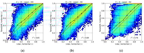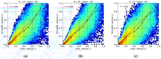Froschham test site. 2-D histogram comparing the L-band TomoSAR and the lidar (50 × 50 m) with (a) in HH, (b) in HV and (c) in HV. The histogram values are in logarithmic scale for better visualization. The black dashed lines indicate the mean values of the TomoSAR as a function of the lidar .