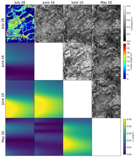 Traunstein test site. L-band interferometric coherences (multilook 20 × 20 m) an corresponding vertical wavenumbers among the same reference track flown at the different considered days in 2014. Top left corner: lidar top height (fine-beam lidar acquisition in November 2012). The range direction is on the horizontal axis of each panel.