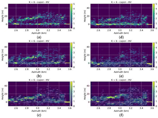 Froschham test site. L-band Capon profiles of coherence matrices (multilook 20 × 20 m) in the full case in the (a) HH and (b) HV polarizations and using (c) , (d) , (e) and (f) . The height axis is referred to the ground topography. The location of the transect is shown in Figure 1b.