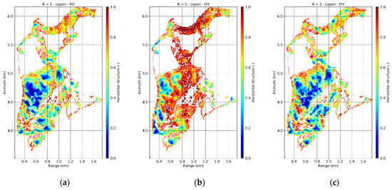 Froshham test site. L-band TomoSAR horizontal structure (50 × 50 m) from Capon profiles with (a) in HH, (b) in HV and (c) in HV.