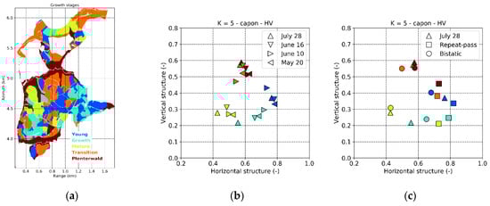 Traunstein test site. (a) Map of growth stages from ground inventory data, forest management information and optical high-resolution images, (b) average values of L-band TomoSAR structure indices for each growth stage for the different acquisition dates plotted in the (, )-plane and (c) mean values of L-band TomoSAR structure indices for each growth stage for the different implementations plotted in the (, )-plane.