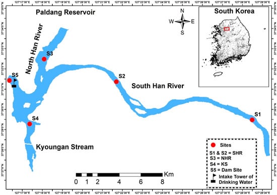 The Paldang Reservoir is situated approximately 45 km northeast of Seoul and provides drinking water for 24 million people [14]. It has an area of 38.2 km2 and a volume of 250 × 106 m3 [11]. The mean and maximum depth of the reservoir is 6.5 m and 25 m, respectively [11]. Five reservoir sampling sites labelled S1–S5 were selected for this study. Sites S1 and S2 were located in the South Han River part of the reservoir. In contrast, S3, S4, and S5 were situated at the North Han River, Kyoungan Stream, and dam, respectively. The water intake tower for Paldang Reservoir is located at S5 (Figure 1). It receives water from three different sources, namely the Kyoungan Stream, South and North Han River, and directly affects the reservoir’s hydrodynamics and water quality [2,11,12,16]. About 95% of the reservoir’s water comes from the North and South Han Rivers, which have relatively good water quality [11]. In contrast with the two sources, Kyoungan Stream has a small flow rate and a lower water quality. The drinking water supply tower is located near Kyoungan Stream’s confluence and this significantly impacts drinking water quality (Figure 1).