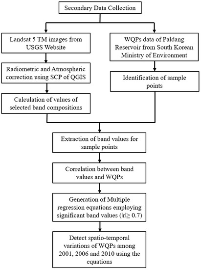 This study solely depends on secondary data. To monitor the water quality parameters (WQPs: TP, BOD, and CHL-a) of a reservoir, several Landsat 5 TM images with band values were acquired and processed. Finally, regression analysis was carried out to establish a relationship between band values of Landsat images and in-situ measurements of WQPs. Figure 2 illustrates the methodological approach of this study.