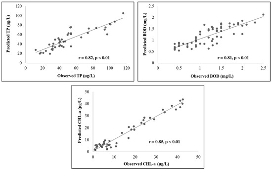Variables with high correlation values (|r| ≥ 0.70) have only been used to generate the empirical model for TP, BOD, and CHL-a (Table 4). The analysis was performed in an online-based calculator until a significant relationship was indicated by the p-value (p < 0.01). Due to an online-based calculator’s automatic iteration power, it is not easy to control the inclusion of any specific independent variables. The p-values for the model show that they have a significant relationship. The developed model using Landsat 5 TM images can detect TP 67% correctly while it was 65% and 72% for BOD and CHL-a, respectively (Table 4). The values of RMSE, RMSLE, MRE and MAE also depict the efficiency of developed models (Table 4). A more efficient TP, BOD, and CHL-a models from Landsat 5 TM can be developed using more sampling point data [21]. Considering our findings, further studies should be carried out with satellite sensors data to develop the empirical models of TP, BOD, and CHL-a. Scatter plots of the observed TP, BOD, and CHL-a data with predicted TP, BOD, and CHL-a values from the generated regression models are shown in Figure 3. For TP, the relationship between observed and predicted values displayed a correlation of 0.82 with p < 0.01. In contrast, it was 0.81 and 0.85 for BOD and CHL-a, respectively with p < 0.01.