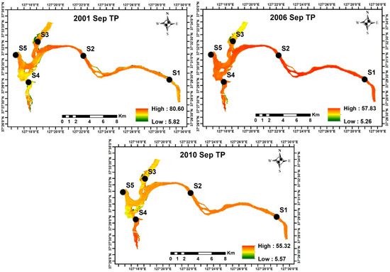 Spatial and temporal pattern of total phosphorus (TP) on September 2001, 2006 and 2010.