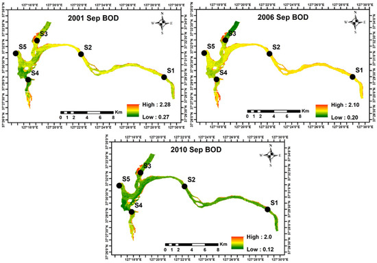 Spatial and temporal pattern of biological oxygen demand (BOD) on September 2001, 2006 and 2010.