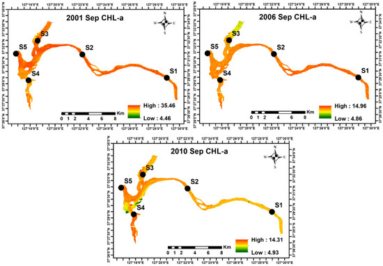Spatial and temporal pattern of chlorophyll-a (CHL-a) on September 2001, 2006 and 2010.