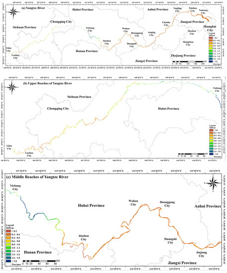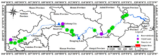 The main stream of the Yangtze River runs through Western China from west to east, between 90°33′–122°25′ E and 24°30′–35°45′ N, corresponding to the entire basin [1]. Above Yichang City, Hubei Province is the upper reaches of the Yangtze River, with a length of 4504 km, drainage area of 100 km2, river width of 0.5–1.5 km, and water depth of 5–20 m. Traditionally, that section is called the upper reaches of the Yangtze River; and the section from Yichang City, Hubei Province to Hukou County of Jiujiang City, Jiangxi Province is called the middle reaches of the Yangtze River, with a length of 955 km, drainage area of 680,000 km2, river width of 1–2 km, and water depth of 6–15 m; Hukou County of Jiujiang City, Jiangxi Province to estuary is called the lower reaches of the Yangtze River, with a length of 938 km, drainage area of 120,000 km2, a river width of 2–4 km, a water depth of 10–20 m, and a river width of more than 15 km [42,43]. Figure 1 shows the research area of this study.