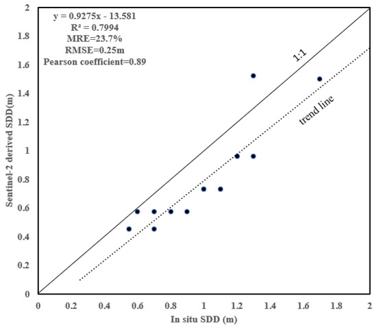 Scatterplots showing the derivation of the accuracies of Sentinel-2 derived SDD in comparison with in situ SDD.