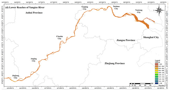 Spatial distribution of SDD in 2017–2020; (a) Yangtze River full view; (b) upper reaches; (c) middle reaches; (d) lower reaches of Yangtze River.