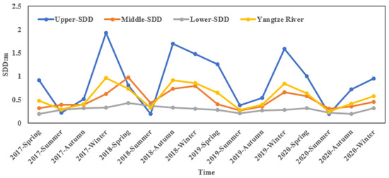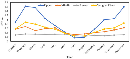 Figure 7 depicts the seasonal variation of SDD in the main stream of the Yangtze River from 2017 to 2020. The seasonal variation range of SDD in the upper reaches of the Yangtze River is large at 1.39, 1.11, 0.26, and 0.87 m in winter, spring, summer, and autumn, respectively. The monthly mean value of the upper reaches is the lowest in June and highest in December. In the middle reaches of the Yangtze River, the mean value of SDD is 0.61, 0.57, 0.35, and 0.46 m in winter, spring, summer, and autumn. The monthly mean value of SDD in the middle reaches of the Yangtze River is the lowest in July and the highest in February. The SDD in the lower reaches of the Yangtze River is higher in winter and spring with the mean value of 0.31 and 0.33 m, respectively, and lower in summer and autumn, with the mean value of 0.28 and 0.27 m, respectively. The monthly mean value of SDD in the lower reaches of the Yangtze River is the highest in February and the lowest in August. The upper, middle, and lower reaches of the Yangtze River are higher in winter and spring and lower in summer and autumn. The maximum and minimum of the monthly mean value of SDD appeared in winter and summer, respectively. The overall seasonal variation of SDD in the main stream of the Yangtze River is similar to that in the upper stream. The mean value of SDD is 0.77, 0.67, 0.29, and 0.53 m in winter, spring, summer, and autumn, respectively. The monthly mean value of the main stream of the Yangtze River is the lowest in July and the highest in December. In addition, the seasonal variation trend of the SDD in Yangtze River is very similar to that in the Upper Yangtze River.