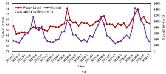 The relationship between runoff, water level, PRCP; (a) the relationship between PRCP and water level; (b) the relationship between PRCP and water level; (c) the relationship between runoff and water level.
