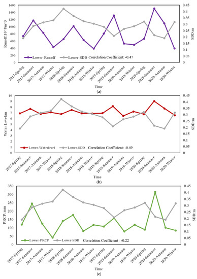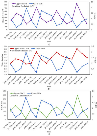 The relationship between the upper reaches of the Yangtze River and runoff, water level, PRCP; (a) the relationship between the SDD and runoff; (b) the relationship between the SDD and water level; (c) the relationship between the SDD and PRCP.